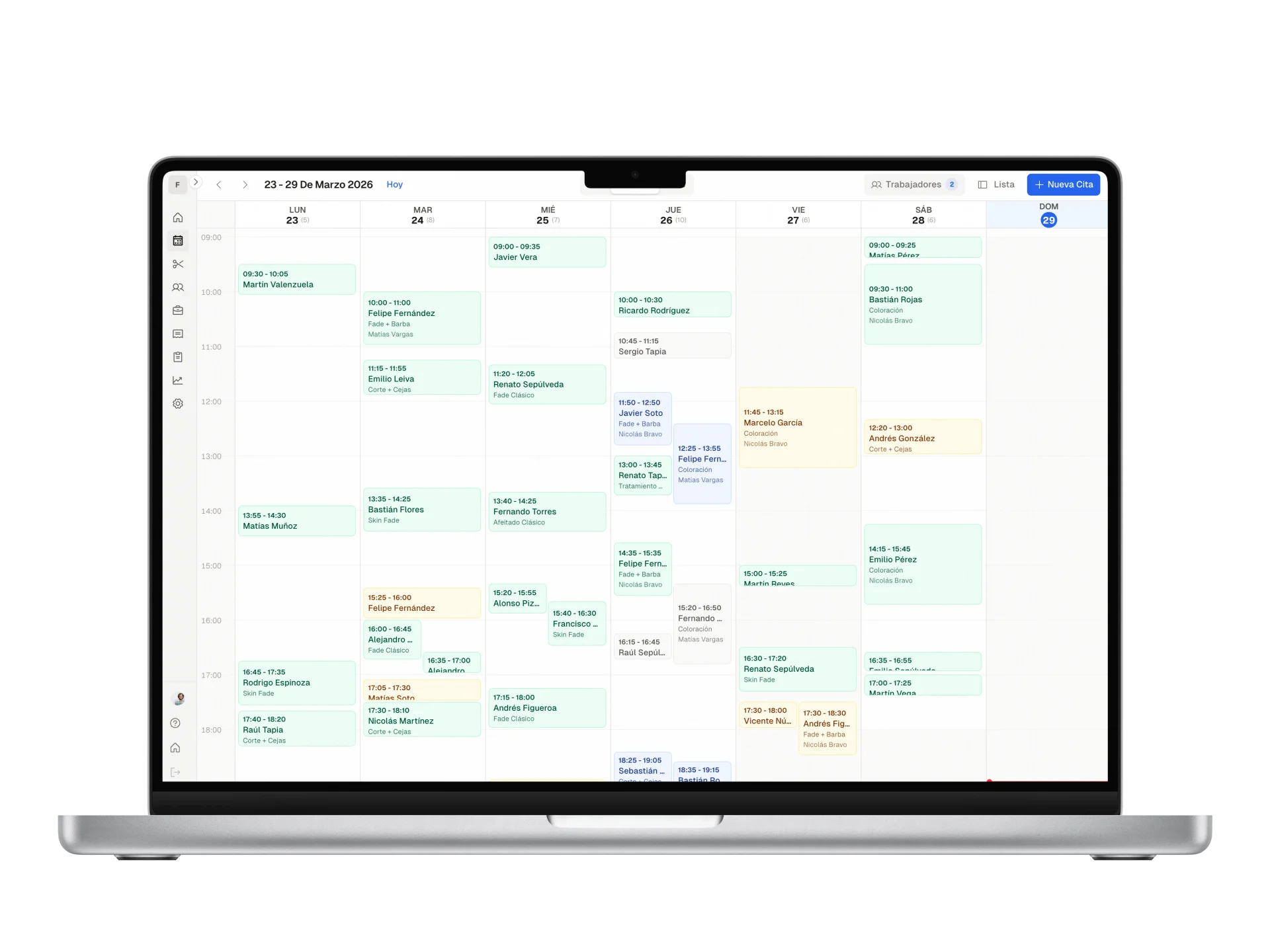 Agenda, clientes, pagos y equipo en una sola plataforma. Desde tu computador o desde tu celular.